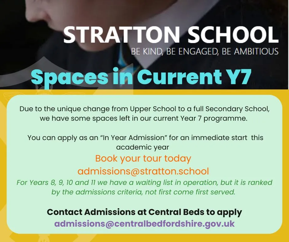 ...We occasionally have space in our school for students to transfer from one setting to us. This can be done at any time of the school year and is called an "In Year" Admission You can apply direct on the CBC website as an "In Year Admission" - click this link --> Applying for a school place during the academic year | Central Bedfordshire Council