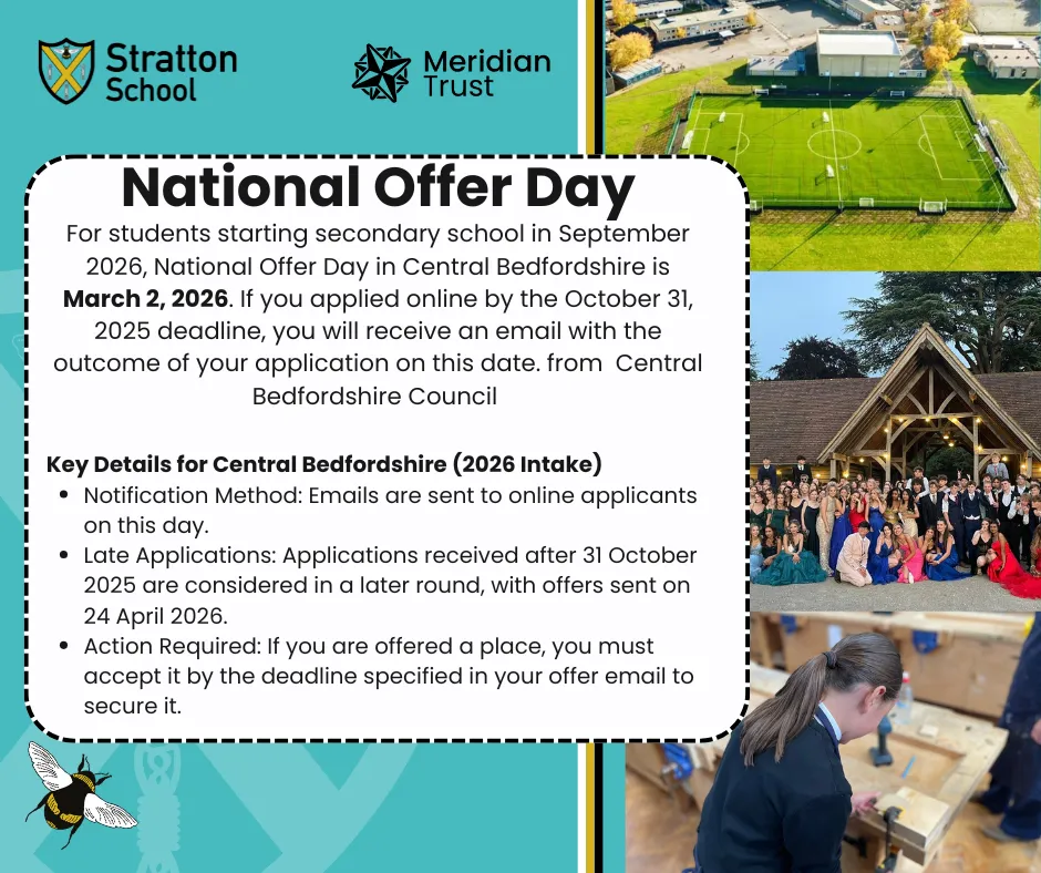 If you’ve been offered a place at Stratton School on March 2nd, please remember to confirm your offer as soon as you receive it. Central Bedfordshire Council will send full details by email, so please keep an eye on your inbox.