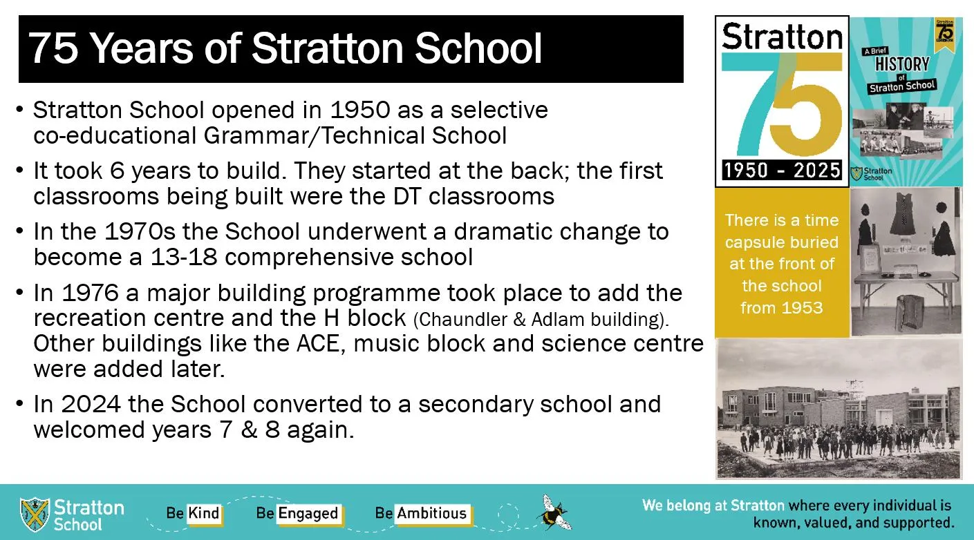 In 1976 the facility was one of many grammar schools in Britain during the period to become a comprehensive. This culminated in a transformative period during the mid-2000s. Stratton was subsequently the first school in the Biggleswade area to apply for and gain academy status in 2011.