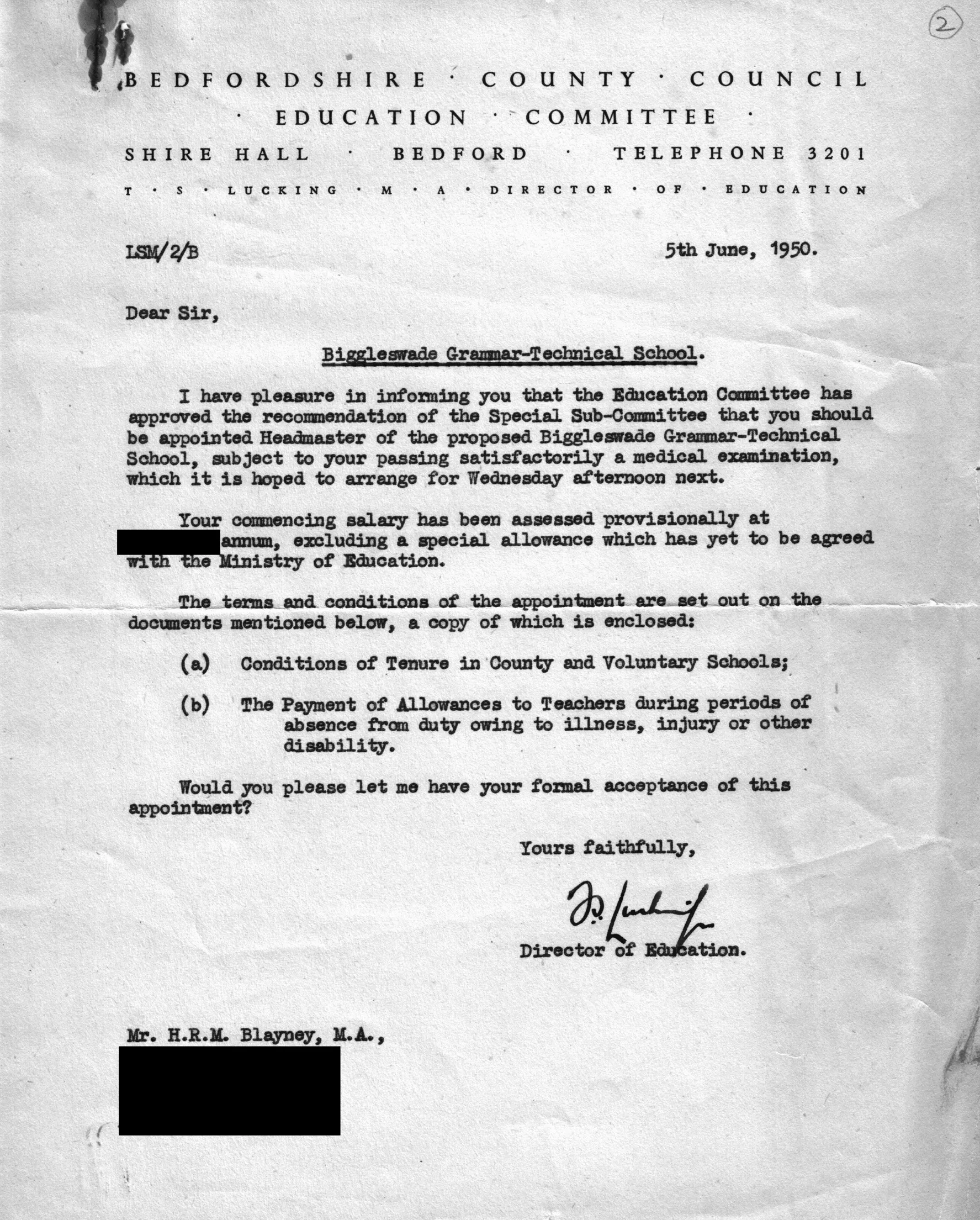 The first formal document confirming the appointment of Mr Blayney and the name "Biggleswade Grammar-Technical School"