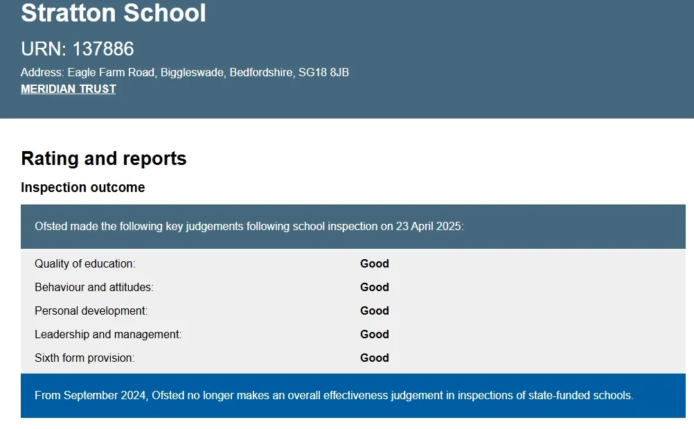 Stratton School has now achieved “Good” ratings across all five key areas: quality of education, behaviour and attitudes, personal development, leadership and management, and sixth-form provision.
