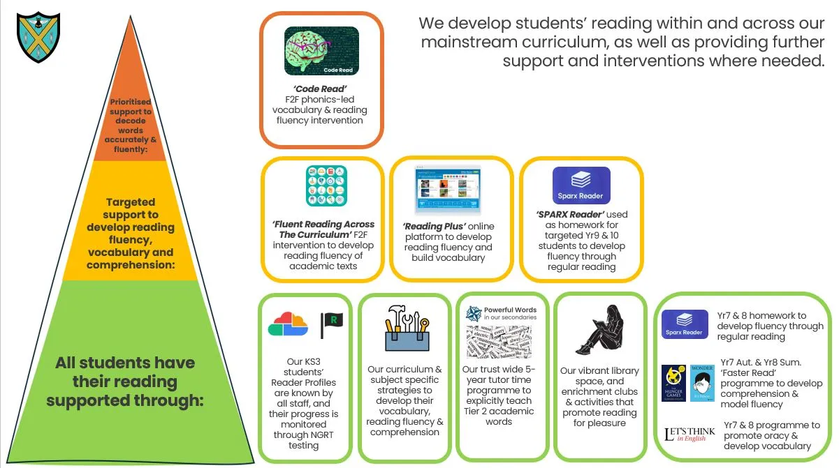 We develop students’ reading within and across our mainstream curriculum, as well as providing further support and interventions where needed.
